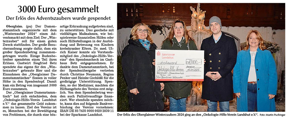 Vorweihnachtliche Spende von 1000,- Euro an den Onkologie Hilfe Verein Landshut