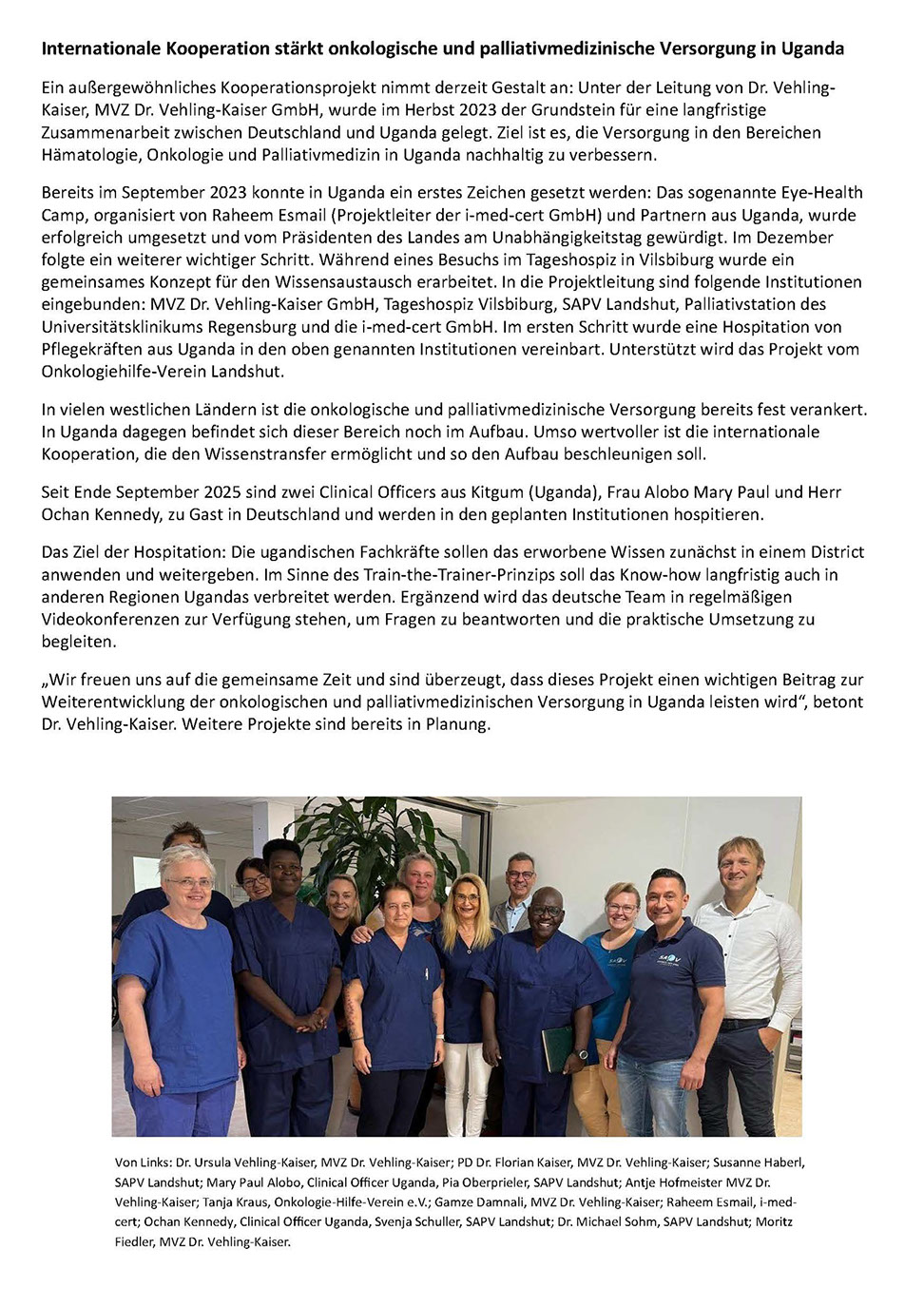 Ein neues internationales Kooperationsprojekt verbindet das Zentrum für Palliativmedizin des Universitätsklinikums Regensburg (UKR), das MVZ Dr. Vehling-Kaiser Landshut und die ugandische Stadt Kitgum. Ziel der Zusammenarbeit ist es, die medizinische Versorgung in den Bereichen Hämatologie, Onkologie und Palliativmedizin in Uganda nachhaltig zu verbessern und auszubauen. Unterstützt wird das Vorhaben vom Onkologie-Hilfe-Verein Landshut.