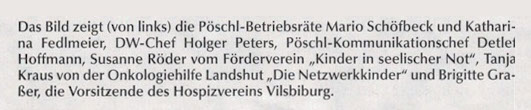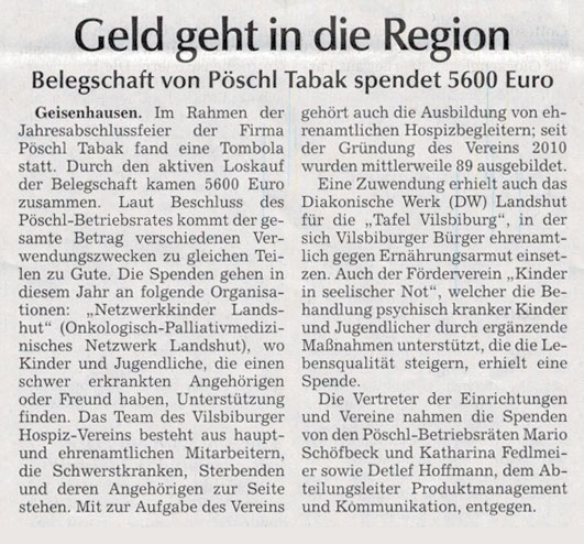 Pöschl spendet 1200 EuroBetrag kommt mehreren Einrichtungen zugute, Geisenhausen. Im Rahmen der Jahresabschlussfeier der Pöschl Tobacco Group fand wieder eine Weihnachts-Tombola statt. Durch den aktiven Loskauf der Belegschaft konnte die Summe von 4800 Euro eingenommen werden. Die Einnahmen konnten zusätzlich gesteigert werden, da der von Katharina Pöschl gezogene Hauptgewinn der Tombola kurzfristig zusätzlich unter der Belegschaft versteigert wurde. Hierdurch konnten weitere Einnahmen von 360 Euro erzielt werden. Laut Beschluss des Pöschl-Betriebsrates kommt der gesamte Betrag verschiedenen Verwendungszwecken zugute.Je 1200 Euro gehen in diesem Jahr an die folgenden Begünstigten: Die „Netzwerkkinder Landshut“ (Onkologisch-Palliativ-medizinisches Netzwerk Landshut), wo Kinder und Jugendliche, die einen schwer erkrankten Angehörigen oder Freund haben, Unterstützung finden. Die Vertreter der Einrichtungen und Vereine nahmen den symbolischen Scheck von den Betriebsräten Stefan Rauscher und Mario Schöfbeck sowie Pressesprecher Alexander Dalli entgegen.
